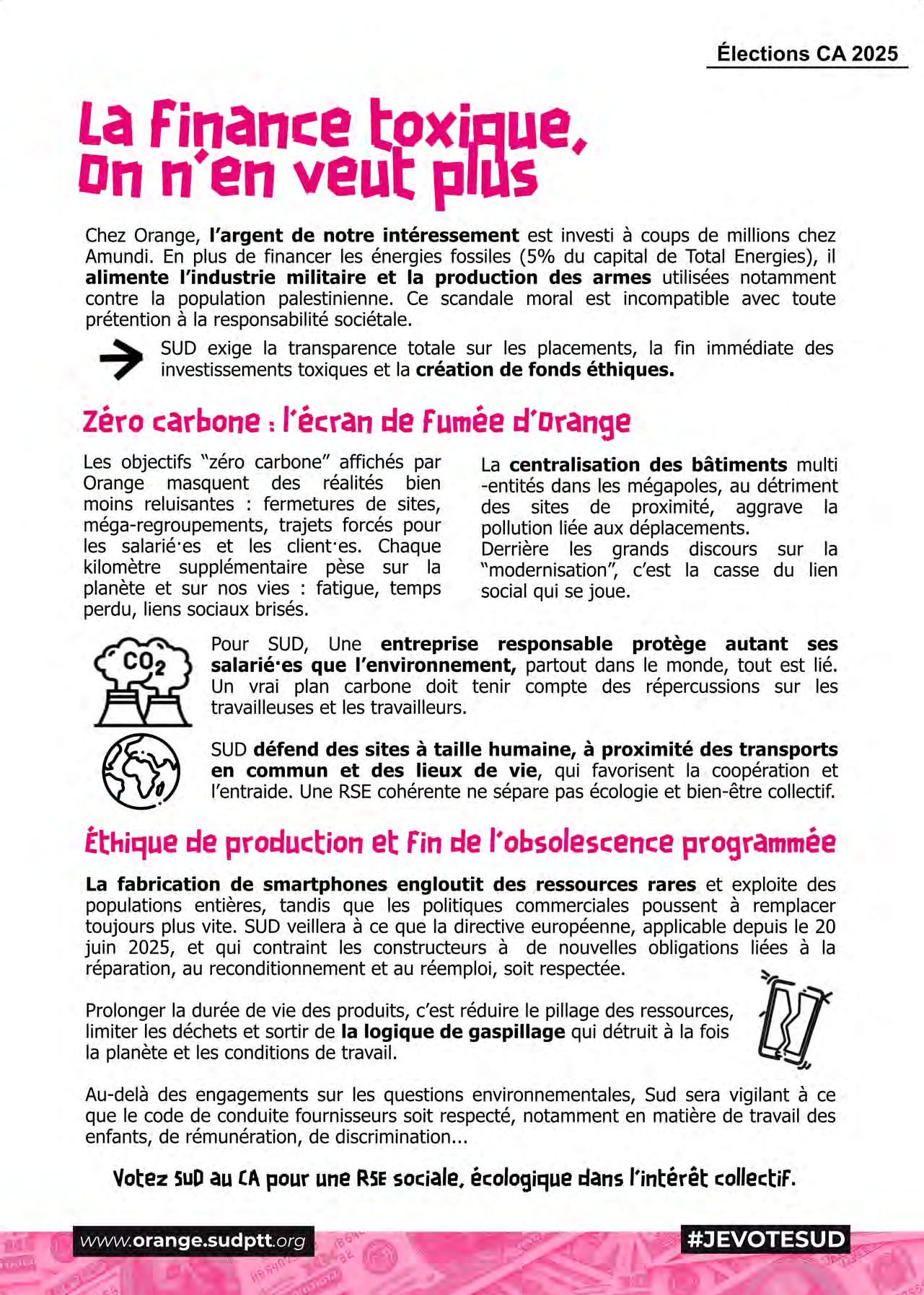 Chez Orange, l’argent de notre intéressement est investi à coups de millions chez AMUNDI. En plus de financer les énergies fosssiles( 5% du capital de Total Energies), il alimente l’industrie militaire et la production des armes utilisées notamment contre la population palestinienne. Ce scandale moral est incompatible avec toute prétention à la responsabilité sociétale.